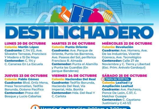 LocalVisitará Destilichadero siete colonias del 20 al 25 de octubre.La redacción11 horas ago18 octubre, 2025199En un punto fijo en un horario de 9:00 am a 3:00 pm de lunes a viernes.