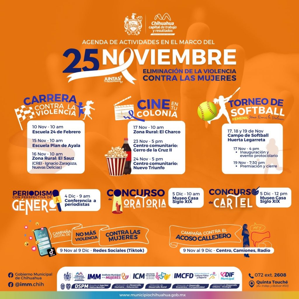 Chihuahua, Chih.- El Gobierno Municipal conmemora noviembre como el mes Internacional de la Eliminación de la Violencia contra la Mujer, por ello el Instituto Municipal de las Mujeres anunció una agenda de actividades para concientizar sobre dicha problemática.