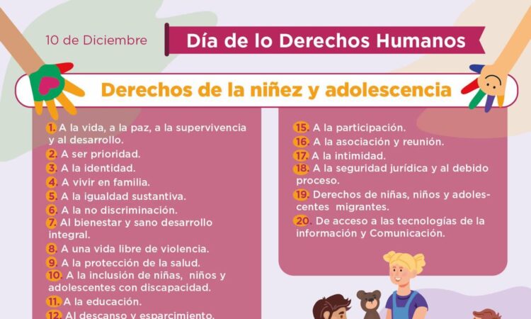En el marco del Día de los Derechos Humanos, el Sistema Municipal de Protección Integral de Niñas, Niños y Adolescentes (SIPINNA), emite los derechos de los infantes para recordarle a los adultos que es necesario respetarlos.El titular del SIPINNA, Luis Hasan Ortiz Enríquez, señaló que las acciones encomendadas por el Presidente Municipal, Cruz Pérez Cuéllar, serán siempre a favor de los derechos de la niñez y adolescencia, por lo que es importante respetar el derecho a la vida, paz, supervivencia y desarrollo de los niños.Así mismo se debe respetar su identidad, y el derecho a vivir en familia, a la igualdad sustantiva, a la no discriminación, al bienestar y sano desarrollo integral, además de tener una vida libre de violencia.Los niños y adolescentes también tienen derecho a la salud, a la inclusión, educación, descanso, esparcimiento, libertad de expresión, participación, intimidad, seguridad jurídica y debido proceso, además de acceso a las tecnologías de la información y comunicación.