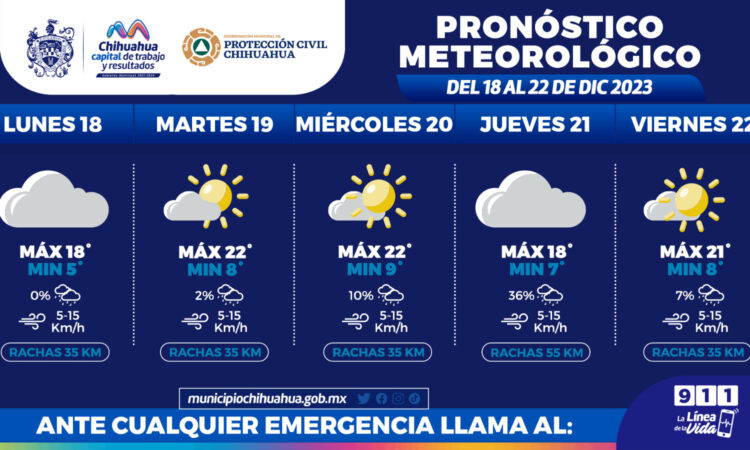 La Coordinación Municipal de Protección Civil, informa que, para esta semana, del 18 al 22 de diciembre se pronostican temperaturas máximas de 22°C con mínimas de 5°C y poca probabilidad de lluvia, por lo que invitan a resguardarse del frío y seguir las recomendaciones para evitar enfermedades respiratorias.