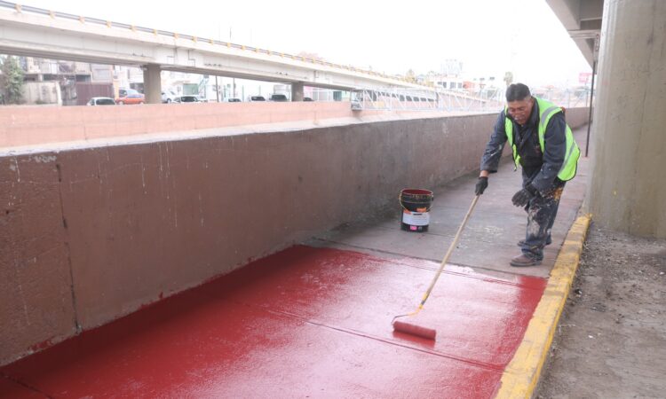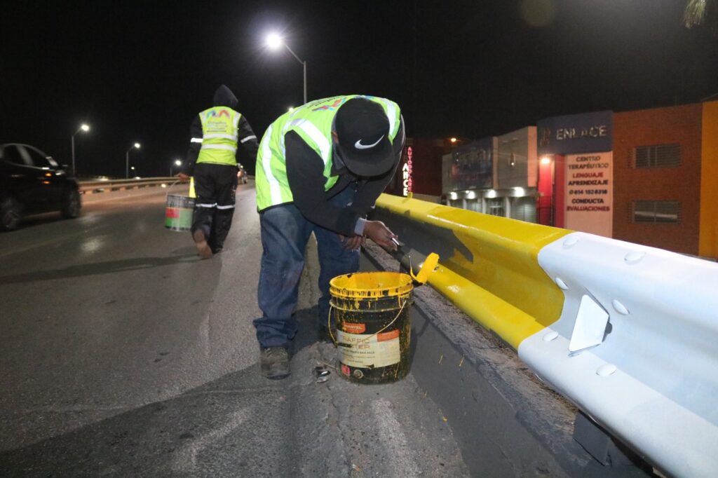 En el caso de los muros de contención, se está aplicando pintura blanca, mientras que en las guarniciones amarillo tráfico y en las banquetas rojo oxido para brindar una mejor visibilidad. Con respecto a los muros de los puentes vehiculares, se está aplicando amarillo tráfico en la parte inferior de los muros, así como blanco en la parte superior.
