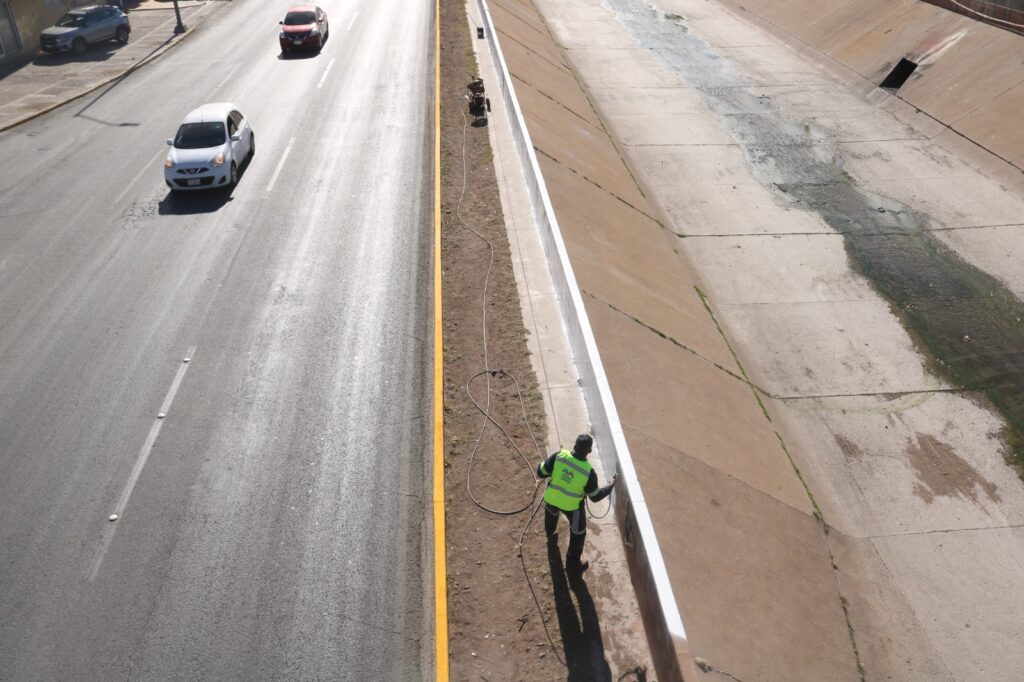 Personal realiza labores de pintura tanto en los muros de contención como en las guarniciones y banquetas para mejorar la visibilidad e imagen de la concurrida avenida.