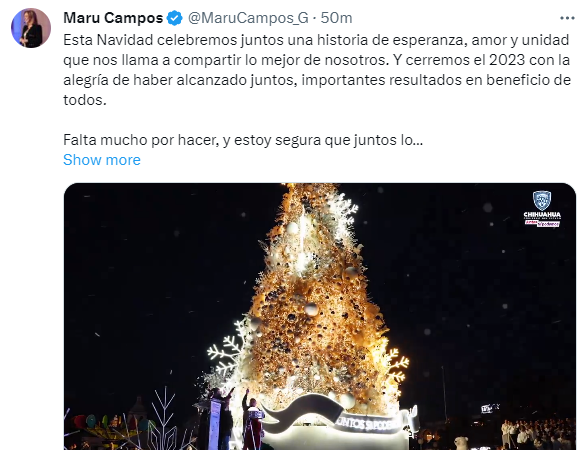 La gobernadora Maru Campos, emitió un mensaje en torno a las fiestas decembrinas que están a punto de celebrarse, en donde mandó un abrazo para todas las familias chihuahuenses y las invitó a vivir estas fiestas con solidaridad, unión y esperanza.