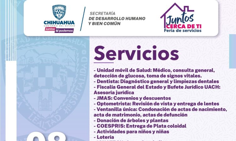 Como parte de las actividades para acercar los servicios del Gobierno del Estado a la ciudadanía, la Secretaría de Desarrollo Humano y Bien Común (SDHyBC) anunció para este jueves 8 de febrero, la feria de servicios “Juntos Cerca de Ti” en la colonia Ponce de León de la ciudad de Chihuahua.