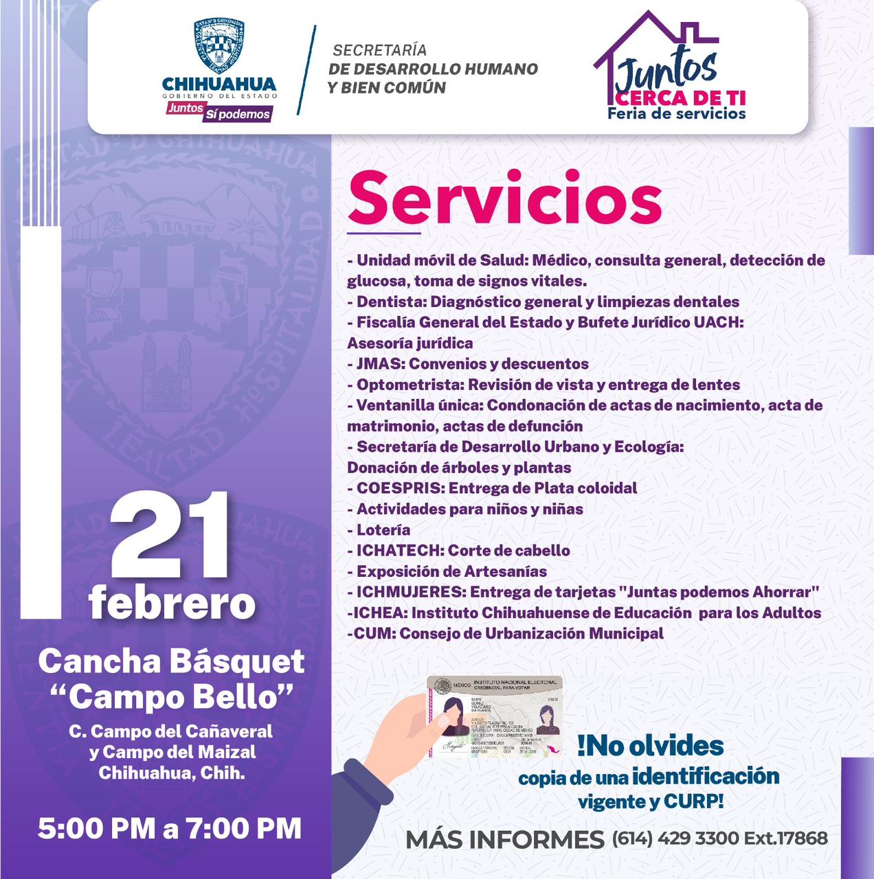 Como parte de las acciones para acercar los servicios del Gobierno del Estado a la ciudadanía, este miércoles 21 de febrero la Secretaría de Desarrollo Humano y Bien Común, atenderá con servicios gratuitos en la colonia Campo Bello, al norte de la ciudad de Chihuahua.