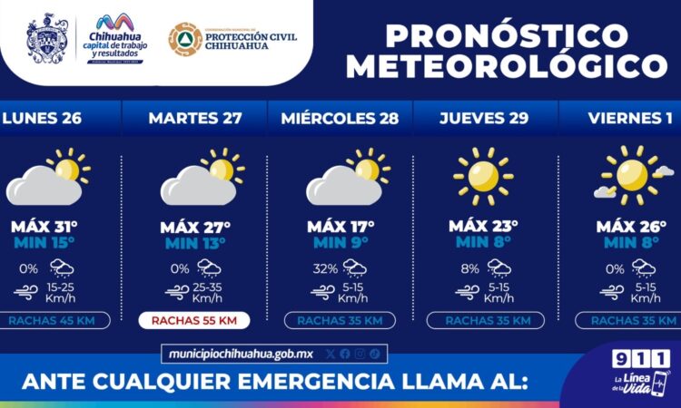 La Coordinación de Protección Civil Municipal, informa que para esta semana se pronostican temperaturas máximas de 31°C con mínimas de 8°C.