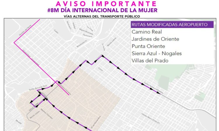 Finalmente para las rutas Aeropuerto, la Camino Real, Jardines de Oriente, Punta Oriente, el recorrido es por avenida Independencia, para dar vuelta en avenida Julián Carrillo y modificar la ruta en calle Niños Héroes para bajar por avenida Independencia hasta Teófilo Borunda para dar vuelta en la calle 13, subir por avenida Niños Héroes y continuar su ruta de manera acostumbrada.