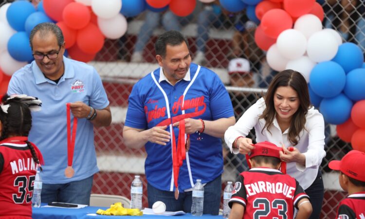 El Presidente Municipal de Ciudad Juárez, junto con su esposa, presidió la apertura de la temporada de verano de la Liga Infantil de Béisbol “Carlos Amaya” en el campo del Parque Galeana, donde más de 130 niñas, niños y adolescentes participarán en esta competencia.