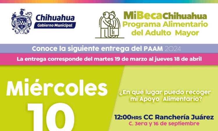 El Gobierno Municipal, a través del DIF, informa a las y los seleccionados del Programa Alimentario del Adulto Mayor (PAAM) que podrán acudir por su paquete alimentario este miércoles 10 de abril en el centro comunitario Ranchería Juárez a las 12:00 horas.