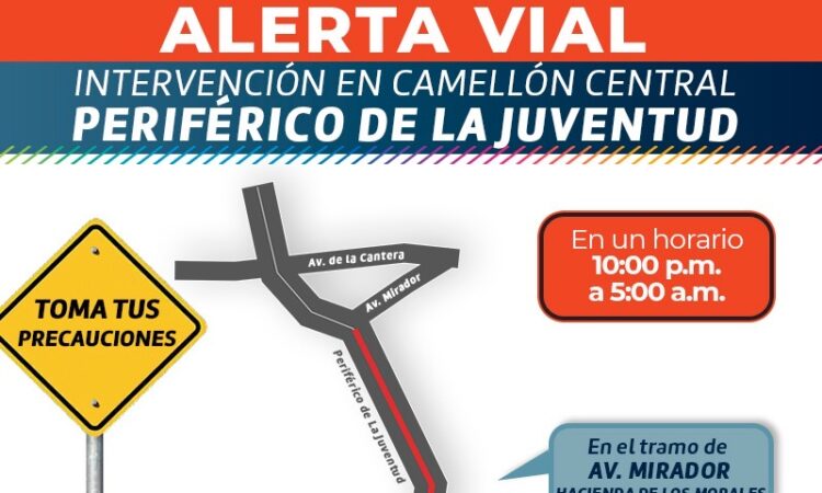 El Gobierno Municipal, a través de la Dirección de Obras Públicas, exhorta a los ciudadanos circular con precaución en Periférico de La Juventud por intervención en el camellón central, entre la avenida Mirador y la calle Hacienda Los Morales.