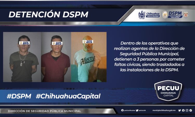 Tal es el caso de la detención de tres personas por faltas cívicas, quienes fueron trasladadas a las instalaciones de la Dirección de Seguridad Pública para su presentación ante un juez cívico para determinar su sanción.