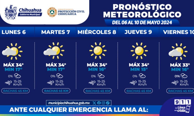 La Coordinación de Protección Civil Municipal informa que para esta semana se prevén vientos con rachas de hasta 45 kilómetros por hora, además de que seguirán las temperaturas máximas en 34°C.