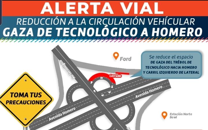 Por otra parte, inicia intervención el día miércoles 22 de mayo en la gaza del trébol de la avenida Tecnológico con destino a la avenida Homero, por lo que se reducirá la circulación en la gaza del trébol y en carril izquierdo de lateral por entrada y salida de maquinaria de lunes a sábado en un horario de 08:00 a 17:00 horas.