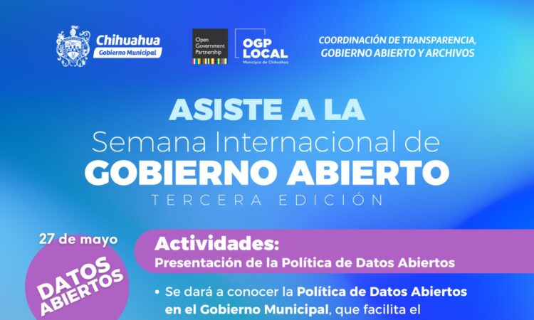 Esta semana, se organiza anualmente por la Alianza para el Gobierno Abierto, a la cual pertenece el Municipio de Chihuahua desde 2022, y tiene el objetivo de que las entidades y países miembros se sumen realizando distintas actividades que promuevan la transparencia, datos abiertos, innovación, participación ciudadana y transparencia inclusiva.