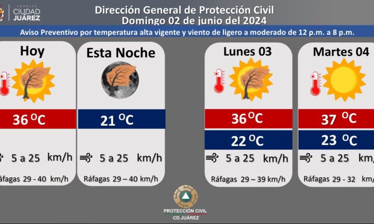 La velocidad del viento oscilará entre 5 y 25 kilómetros por hora con la posibilidad de ráfagas de viento con una velocidad entre 29 y 40 kilómetros, pasando el viento de ligero a moderado de las 12:00 a las 20:00 horas.