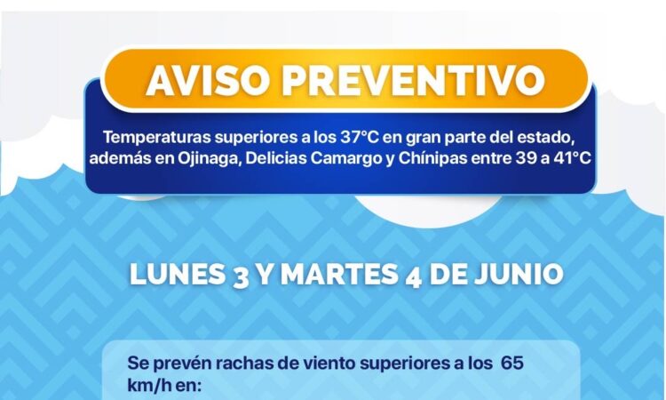 Las temperaturas máximas y mínimas que se esperan para el martes 4 son (máx/min) (°C): Chihuahua 37/20, Juárez 37/23, Janos 34/17, Madera 28/8, Temósachic 30/6, Cuauhtémoc 31/13, Ojinaga 41/23, Delicias 39/21, Camargo 38/21, Jiménez 37/20, Parral 35/19, Creel 27/6, Chínipas 40/21, Guachochi 26/6 y El Vergel 26/5.