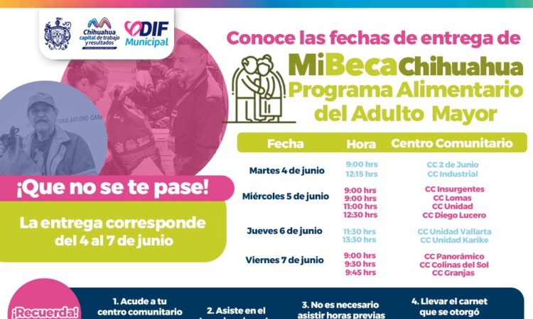 En atención al compromiso que el Gobierno Municipal tiene con las y los adultos mayores de Chihuahua Capital, para garantizarles una mejor calidad de vida, a través del DIF, se informa a las y los seleccionados del Programa Alimentario del Adulto Mayor (PAAM) los Centros Comunitarios a los que podrán acudir por su entrega, en la semana del 4 al 7 de junio: