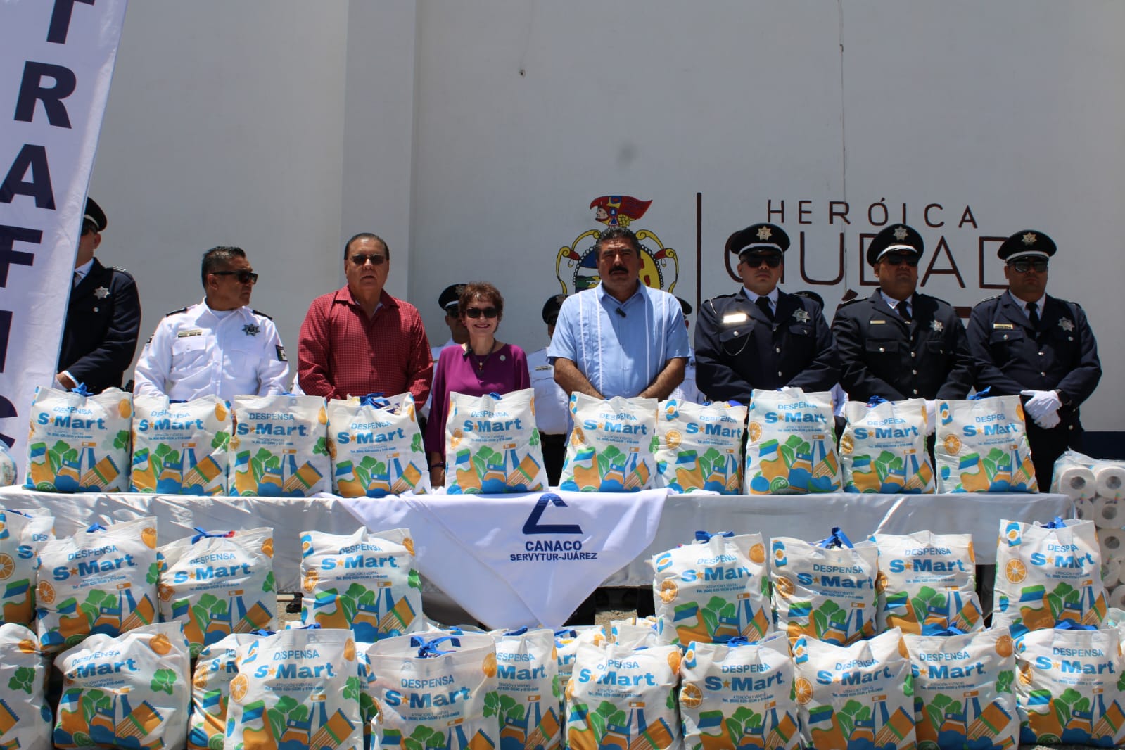 En reconocimiento a su entrega y servicio a la comunidad, agentes de la Coordinación General de Seguridad Vial recibieron este día un donativo de 80 despensas por parte de la Cámara Nacional de Comercio (Canaco).