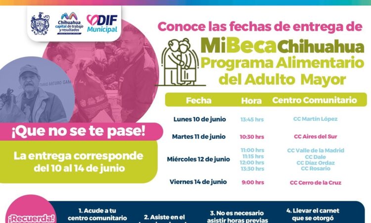 En atención al compromiso que el Gobierno Municipal tiene con las y los adultos mayores de Chihuahua Capital, para garantizarles una mejor calidad de vida, a través del DIF, se informa a las y los seleccionados del Programa Alimentario del Adulto Mayor (PAAM) los centros comunitarios a los que podrán acudir por su entrega, en la semana del 10 al 14 de junio: