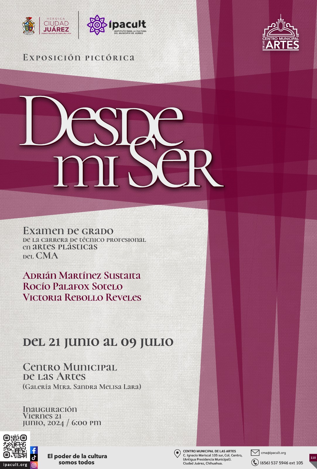 El Instituto para la Cultura del Municipio de Juárez (IPACULT) invita a la inauguración de la exposición de artes plásticas titulada “Desde mi Ser”, organizada en colaboración con la Universidad Autónoma de Ciudad Juárez (UACJ), que tendrá lugar el próximo viernes 21 de junio en dos ubicaciones distintas: el Centro Municipal de las Artes y la Sala de Arte German Valdés “Tin Tan”.