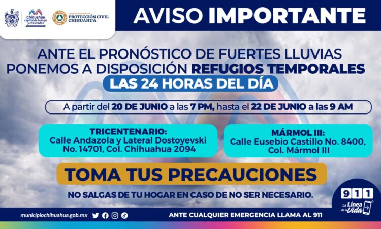 Iván Rivera, coordinador de Protección Civil Municipal, informó que los refugios temporales están ubicados en el centro comunitario Mármol III de la calle Eusebio Castillo número 8400 de la colonia Mármol lll en la zona sur; y en el centro comunitario Tricentenario, en calle lateral Dostoievski y calle Andazola #14701 en colonia Chihuahua 2094 en la zona norte de la ciudad.