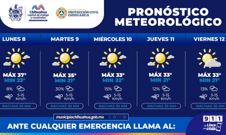 La Coordinación de Protección Civil Municipal, informa que para esta semana se pronostican temperaturas máximas de 37°C con mínimas de 21°C, sí como lluvias ligeras para toda la semana.