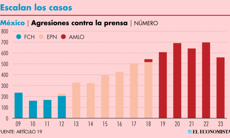 Leopoldo Maldonado, director regional de Artículo 19 de México y Centroamérica, indicó que, durante este sexenio, se registraron 3,408 agresiones contra periodistas, con un aumento del 62.13% respecto al gobierno encabezado por Enrique Peña Nieto.