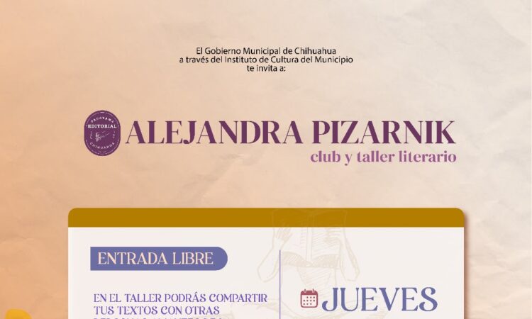 El Instituto de Cultura del Municipio, invita a todos los amantes de la lectura y la escritura a participar en el club y taller literario “Alejandra Pizarnik”, espacio literario que se llevará a cabo todos los jueves, de 5:00 pm a 7:00 pm, en el Espacio PECH, anexo a la Biblioteca Fundadores en el Parque Huerta Legarreta.