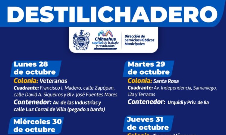 Para evitar acumulaciones de basura de grandes dimensiones en las viviendas, que podría generar plagas o problemas de salud, el Gobierno Municipal, a través de la Dirección de Servicios Públicos Municipales, informa el calendario del programa Destilichadero, que se realizará del 28 al 31 de octubre en cuatro colonias de la Capital.