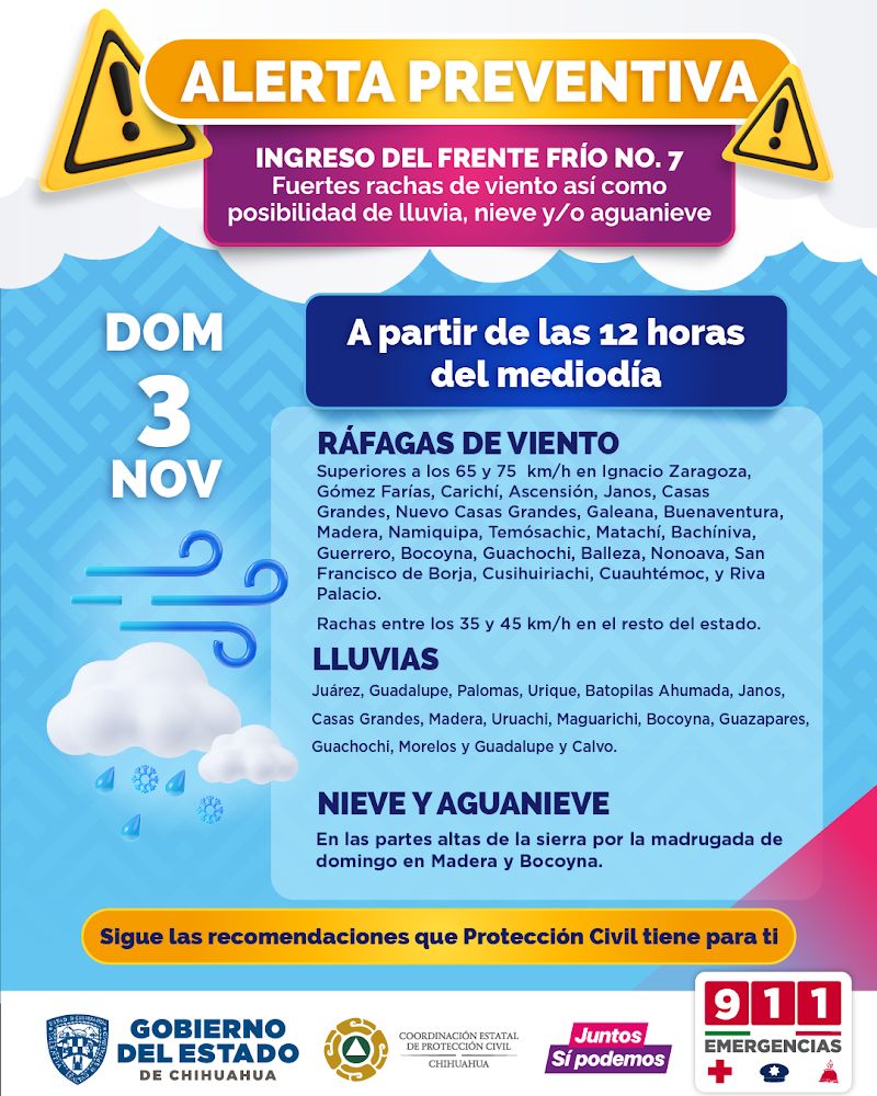 Para este viernes 1 de noviembre se esperan ráfagas de viento que pueden superar los 45 km/h en: Ahumada, Ascensión, Gómez Farías, Namiquipa, Temósachic, Matachí, Bachíniva, Guerrero, Carichí, San Francisco de Borja, Cuauhtémoc, El Sueco, Allende, López, Coronado, Jiménez y Ojinaga.