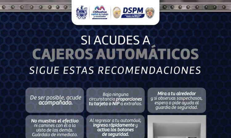 La Dirección de Seguridad Pública Municipal (DSPM) brinda recomendaciones si acudes a retirar dinero a cajeros automáticos para que lo hagas de manera segura y sin contratiempos, especialmente cuando se realiza durante la noche o en áreas desoladas con poca iluminación.