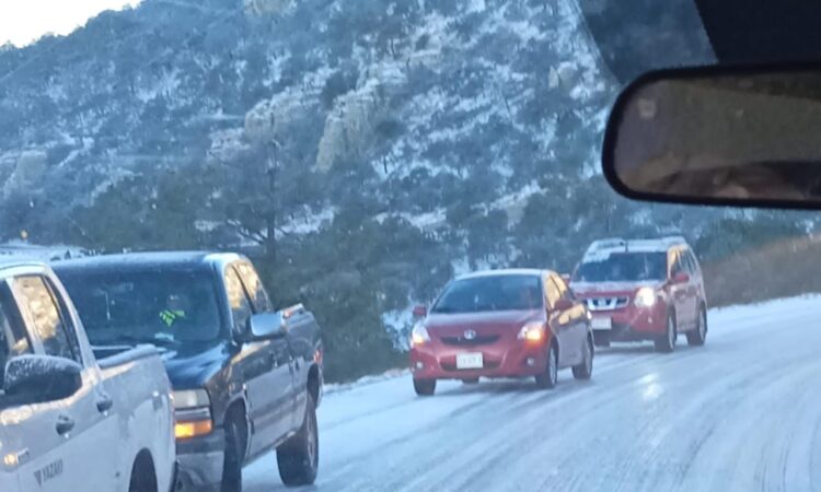 Por otro lado, en la vía Soto Maynez – Gómez Farías – Buenaventura, en el tramo conocido como “Las Emes”, se registró cristalización en la superficie de rodamiento, por lo que fue necesario cerrarlo temporalmente desde las 6:30 a.m. hasta las 10:55 a.m, tras las labores de aplicación de sal y arena.