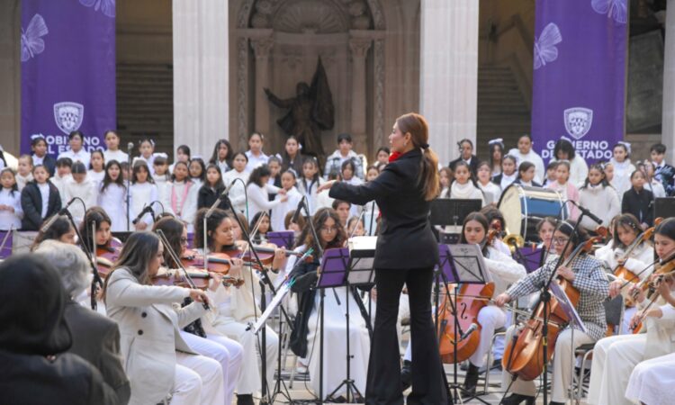El evento se desarrolló en el Patio Central de Palacio de Gobierno, donde las participantes, bajo la dirección de la maestra Melodía Gaytán, dieron muestra del trabajo académico y artístico del modelo educativo “Música en mi Escuela”.