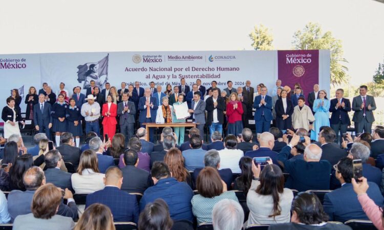 El primero, es el reconocimiento ¿Qué nos une? El reconocimiento del agua como un bien nacional, como un recurso natural, el agua no como una mercancía, sino como un derecho, en donde nos debe permitir que cada mexicana y mexicano tenga acceso al agua de calidad, con suficiencia, nos une que haya agua suficiente para la producción de alimentos, que haya agua suficiente para el desarrollo del país y eso solo podemos hacer juntos y juntas en un programa integral, en un Plan Nacional Hídrico, no solamente estos seis años sino en el largo plazo tener una visión para la sustentabilidad y el desarrollo equitativo de nuestro país”, explicó durante su discurso.