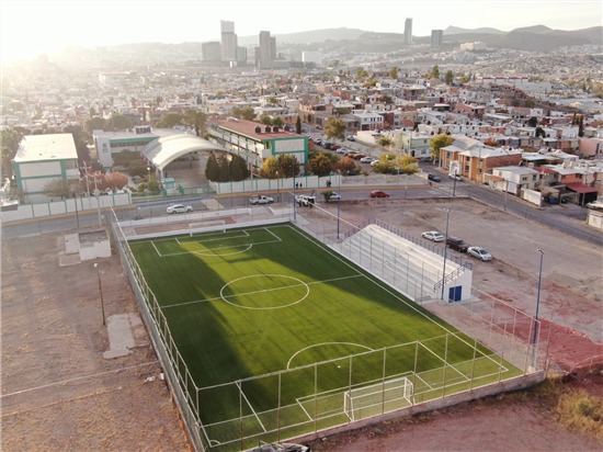 Asimismo, se concretó la construcción del campo de Futbol 7X7, del Cobach 4, que fue dotado de pasto sintético, baños, gradas y luminarias. Destaca también la rehabilitación del centro comunitario Dale, de las calles 36 y Urueta, y la construcción del domo metálico y cancha en el parque de la colonia Rinconadas de Sierra Azul.
