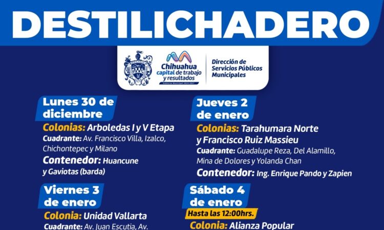 Para evitar acumulaciones de basura de grandes dimensiones en las viviendas, que podría generar plagas o problemas de salud, el Gobierno Municipal, a través de la Dirección de Servicios Públicos Municipales, informa el calendario del programa Destilichadero, que se realizará del 30 de diciembre al 4 de enero en seis colonias de la Capital.