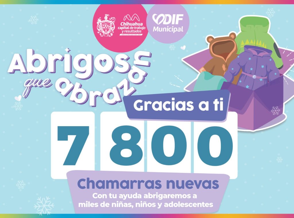 La presidenta del DIF Municipal, Karina Olivas, agradeció a las y los chihuahuenses que se sumaron a la campaña “Abrigos que Abrazan” pues se reunieron más de 7 mil 800 chamarras nuevas, cuando la meta era de 7 mil 500, mismas que se donan a niñas, niños y adolescentes de zonas vulnerables de la ciudad.