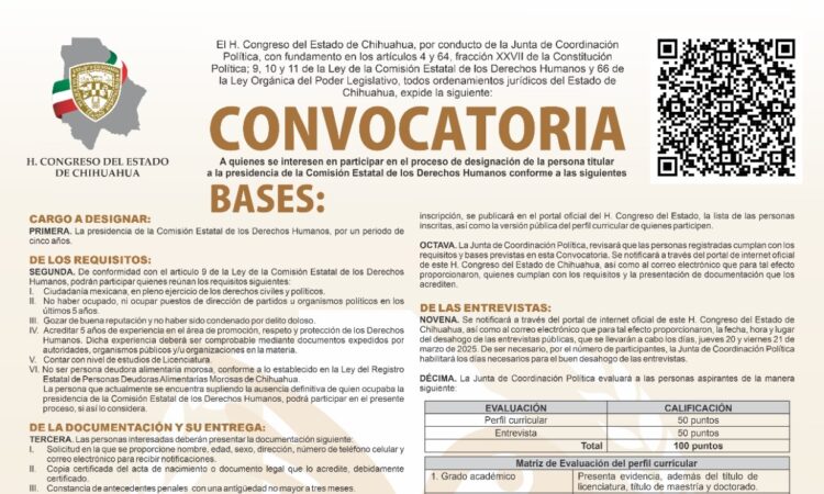 Con esta convocatoria, se buscan candidatos idóneos para asumir el cargo de Presidente de la CEDH por un periodo de cinco años, por lo que se invita a todas las personas interesadas y calificadas a participar activamente en este proceso transparente y abierto.