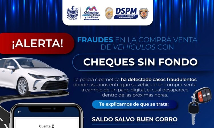 La Policía Cibernética del Municipio de Chihuahua, alerta por transacciones falsas para compra venta de automóviles mediante “cheques sin fondos” y emite recomendaciones para evitar caer en estas estafas.