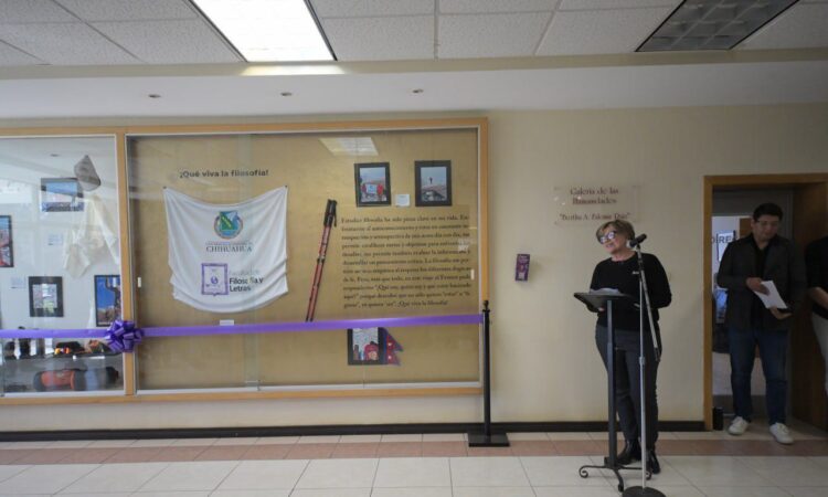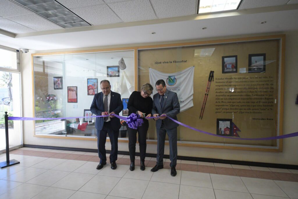 En el vestíbulo de la Facultad de Filosofía y Letras, el Rector de la UACH, Mtro. Luis Alfonso Rivera Campos, encabezó la inauguración de la exposición “¡Que viva la Filosofía!”, la cual destaca la travesía y logros de la alumna Mercedes Reza.