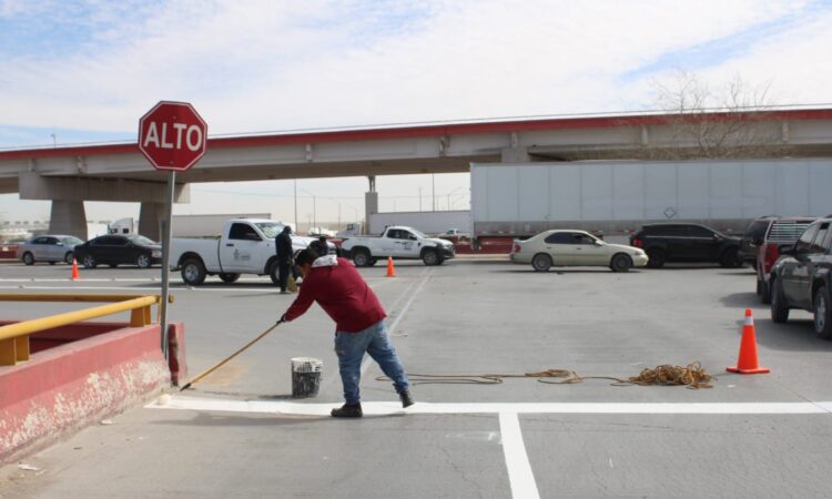 Ciudad Juárez.- Con la finalidad de mejorar las condiciones de las vialidades en los distintos sectores de la ciudad, personal de la Coordinación General de Seguridad Vial pintó las líneas para la separación de carriles de circulación vehicular sobre el puente y los alrededores de la Glorieta del kilómetro 20.