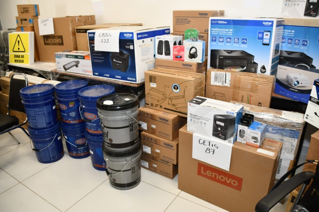 El material incluye computadoras, pantallas digitales, proyectores portátiles, discos duros, audífonos, bocinas, impresoras, multifuncionales, señalización, sillones, sillas, mesas, escritorios, lámparas exteriores, focos, pintura, impermeabilizante, dispensadores de agua, entre otros materiales.
