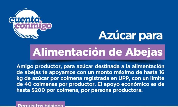 A través de este programa se respalda la producción apícola, mediante la entrega de hasta 16 kilogramos de azúcar por colmena registrada en la Unidad de Producción Pecuaria (UPP), con un máximo de 40 por persona y un monto de hasta 200 pesos por cada una.