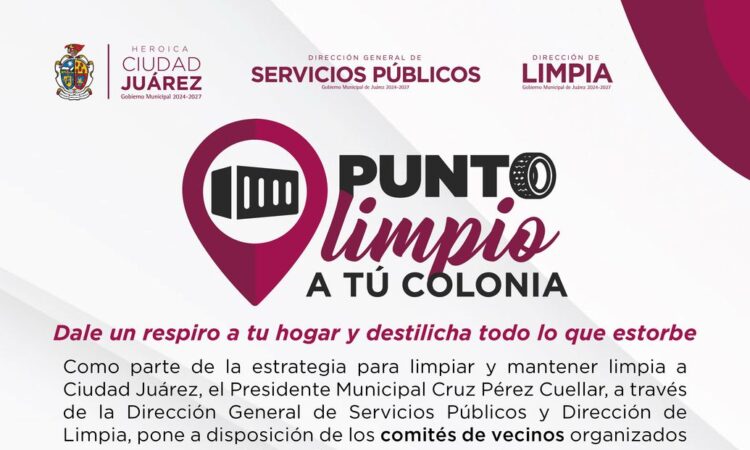 Como parte de la estrategia para limpiar y mantener en buenas condiciones de aseo a Ciudad Juárez, el Presidente Municipal, Cruz Pérez Cuéllar, a través de la Dirección General de Servicios Públicos y la Dirección de Limpia, pone a disposición de los vecinos organizados el servicio “Punto Limpio a tu Colonia”.