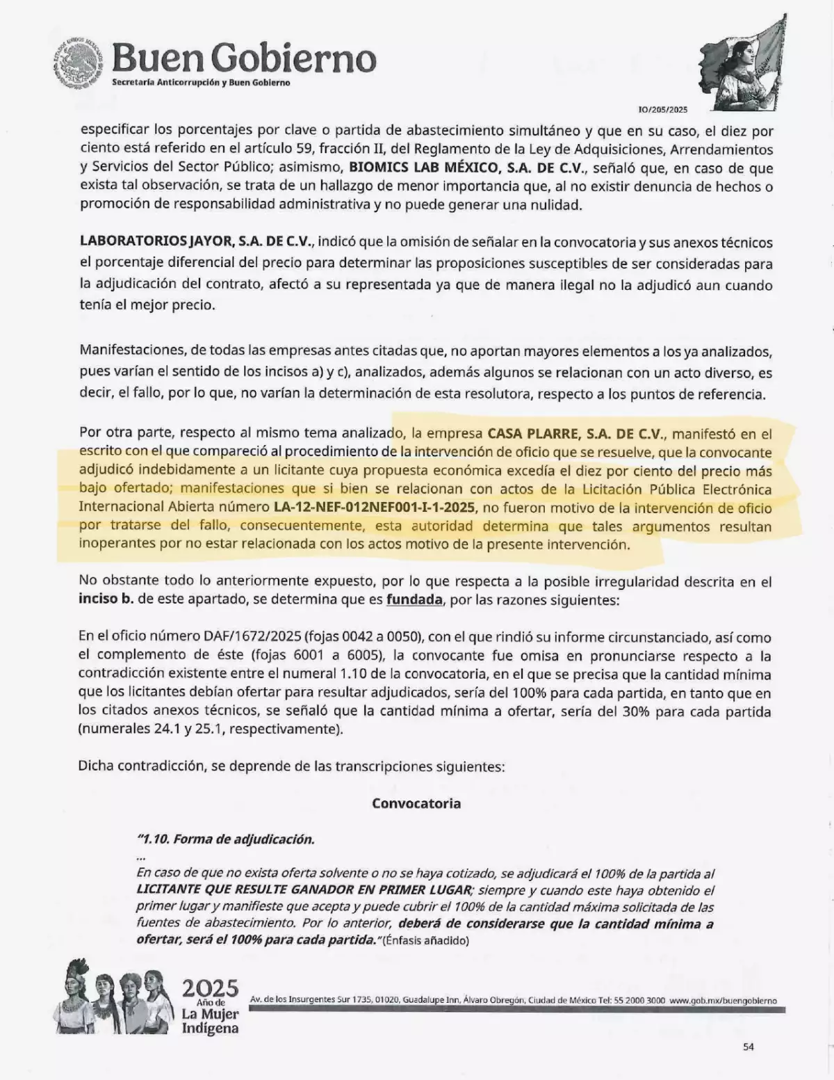 Sin embargo, la indagatoria se centró en los primeros pasos del procedimiento: la publicación de la convocatoria, los anexos técnicos y la junta de aclaraciones (donde los proveedores exponen sus dudas). No se evaluó el fallo de la licitación ni se documentó cómo fue que Birmex asignó los contratos con sobreprecio. Tampoco detalla por qué la paraestatal rectificó el fallo cuatro días después de emitido.