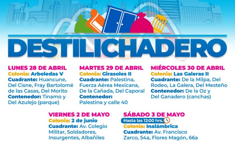 Para evitar acumulaciones de basura de grandes dimensiones en las viviendas, que podría generar plagas o problemas de salud, el Gobierno Municipal, a través de la Dirección de Servicios Públicos Municipales, informa el calendario del programa Destilichadero, que se realizará del 28 de abril al 3 de mayo en cinco colonias de la Capital.