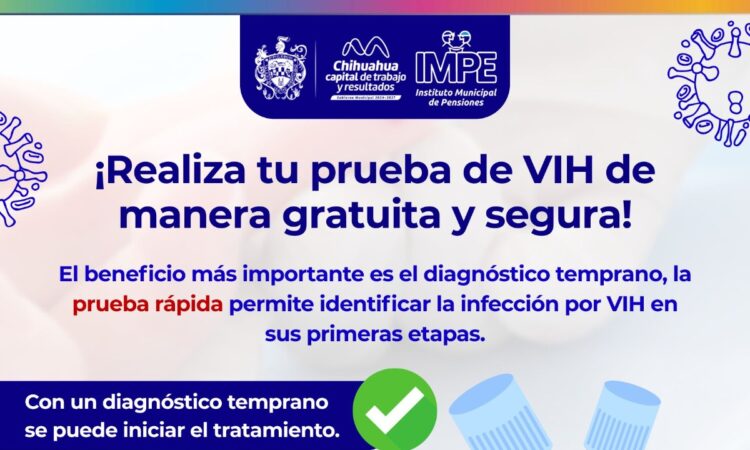 El Gobierno Municipal, por medio del Instituto Municipal de Pensiones (IMPE), invita a la ciudadanía en general y a derechohabientes, a realizarse la prueba rápida, para detectar oportunamente el Virus de la Inmunodeficiencia Humana (VIH), la cual se realiza de manera gratuita y segura.