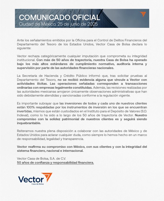 El banco Vector aseguró este miércoles que durante más de cinco décadas de trayectoria, siempre ”ha operado bajo los más altos estándares de cumplimiento normativo, auditoría interna y supervisión por parte de las autoridades financieras”.