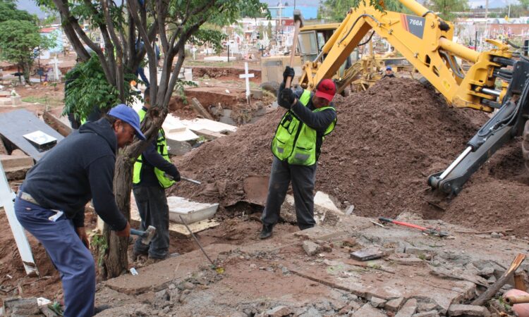 La zona dañada equivale a aproximadamente 200 metros cuadrados.El desprendimiento de tierra provocó el desplazamiento de 15 lápidas y la exposición de un cuerpo, el cual ya fue trasladado a las instalaciones de la Fiscalía General del Estado para su resguardo.Personal de Servicios Públicos trabaja en la recolocación de las lápidas afectadas.
