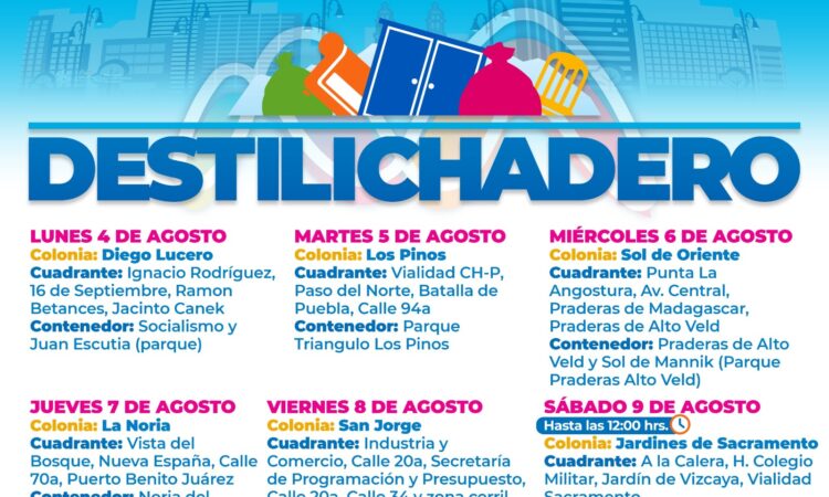 El Destilichadero consiste en retirar basura de grandes dimensiones que el camión recolector no puede trasladar, por lo que se pone a disposición de la población un contenedor en un punto fijo en un horario de 9:00 am a 3:00 pm de lunes a viernes, mientras que el sábado de 9:00 de la mañana a 12:00 del mediodía.